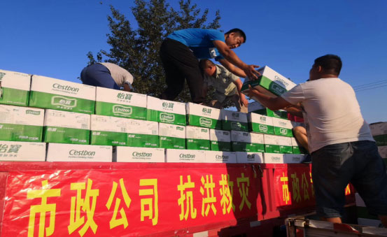 2018年8月25日,由公司董事長(zhǎng)、總經(jīng)理王曉軍帶隊(duì),將738箱礦泉水、7950斤掛面和114箱方便面等價(jià)值48906元的應(yīng)急救災(zāi)生活物資送到受災(zāi)嚴(yán)重的營(yíng)里鎮(zhèn)周家村和吳家村賑濟(jì)災(zāi)民。