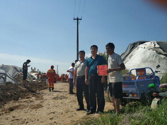 2018年8月14日以來,受“摩羯”、“溫比亞”雙臺風影響,我市連降特大暴雨,加之上游水庫大流量泄洪,致使紀臺、稻田、上口、營里、羊口等鄉(xiāng)鎮(zhèn)部分村莊遭受大災,我單位11戶職工家中大棚受淹或家中進水,給其造成不同程度的經(jīng)濟損失。其中孟永勝、張世威2名職工老家大棚進水倒塌,損失慘重;李金輝、常文亮2名職工大棚進水,作物絕收;周華欽、李鵬、楊新國、韓曉亮、郝慶濱、張靜、王建偉7名職工老家河水倒流,屋內(nèi)積水,有的還造成地基下陷,損失嚴重。
