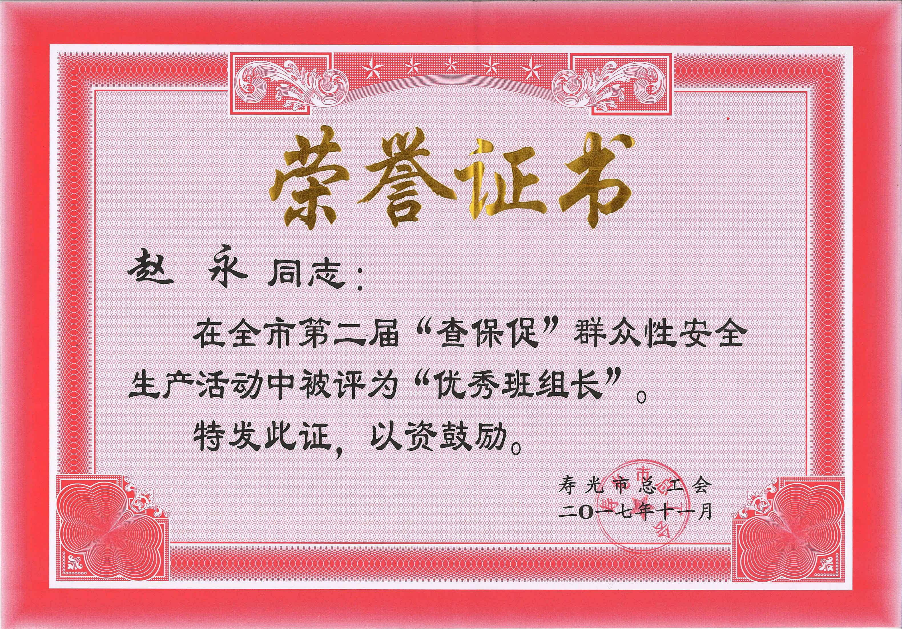 日前,在全市第二屆“查保促”群眾性**生產活動中,我單位職工趙永同志榜上有名,被壽光市總工會評為**班組長。