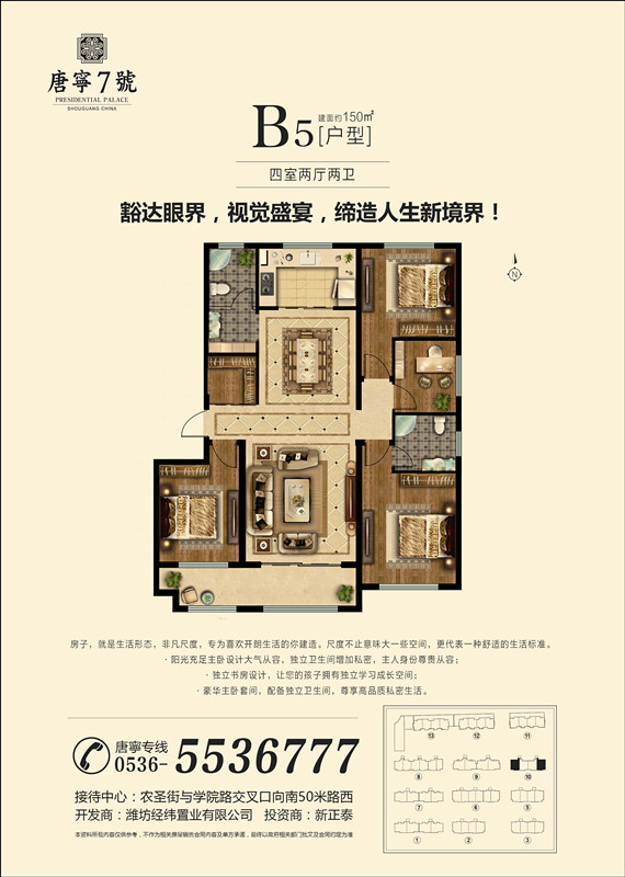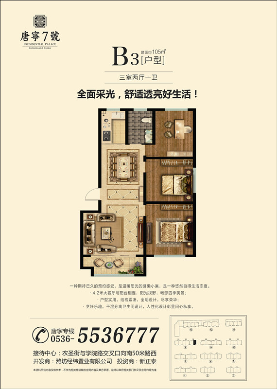 無論在地段、環(huán)境、配套、建筑、景觀、戶型設(shè)計以及物業(yè)管理等方面,都是壽光首屈一指的。擁有唐寧7號不僅是您身份和檔次的象征,也必將是您居住和投資的**佳選擇!
