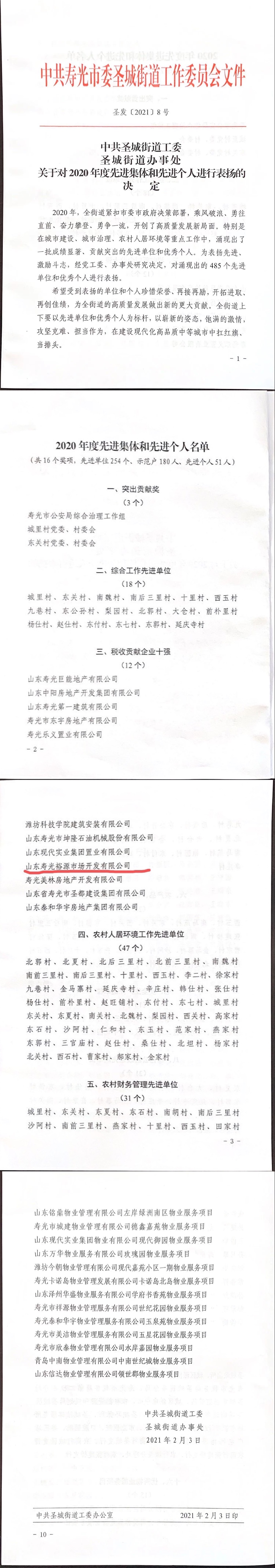 2021年3月,新正泰控股公司山東壽光裕源市場(chǎng)開發(fā)有限公司被中共壽光市圣城街道工作委員會(huì)授予“稅收貢獻(xiàn)企業(yè)十強(qiáng)”榮譽(yù)稱號(hào)。