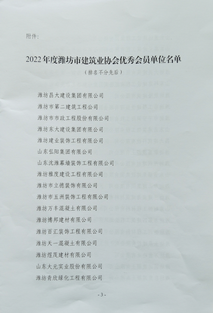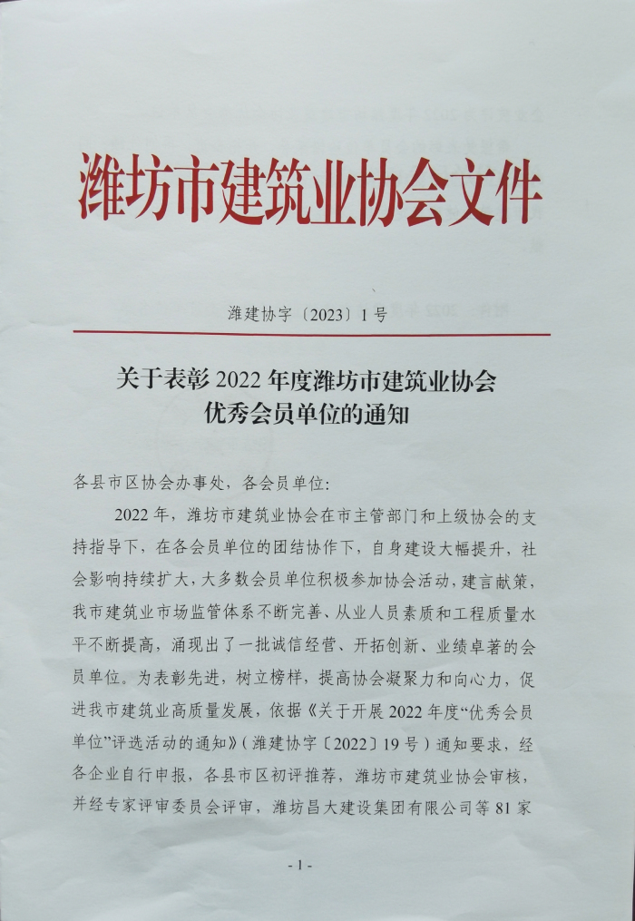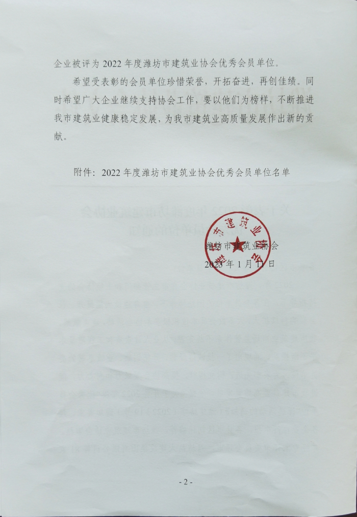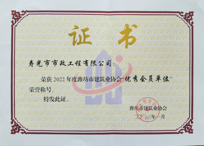 近日,濰坊市建筑業(yè)協(xié)會下發(fā)文件,公布了2022年度濰坊市建筑業(yè)協(xié)會優(yōu) 秀會員單位名單,我單位位列其中。此榮譽的獲得,充分體現(xiàn)了公司在我市建筑業(yè)的綜合競爭優(yōu)勢,彰顯了行業(yè)地位,是對公司從業(yè)人員素質、工程質量和企業(yè)管理水平等工作的肯定和認可。